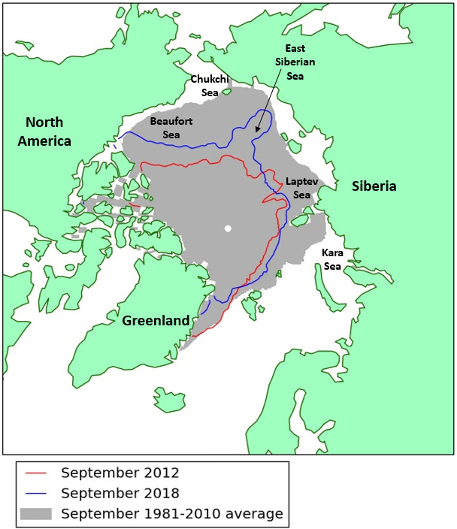 Figure 2. Arctic sea ice extent, September 2018, compared to the record low year of 2012 and the 1981-2010 average, with regions named in the text labelled. Data are from HadISST1.2.