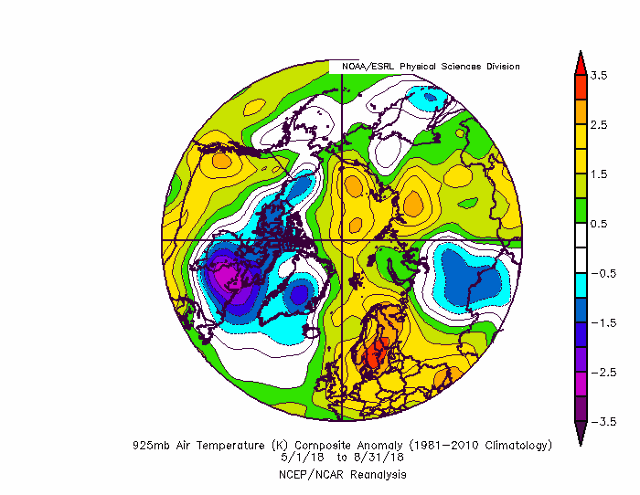 Figure 3. Anomaly in (left) mean sea level pressure; (right) air temperature at 925mb for May-August 2018 relative to the 1981-2010 average. Data are from the NCEP reanalysis.