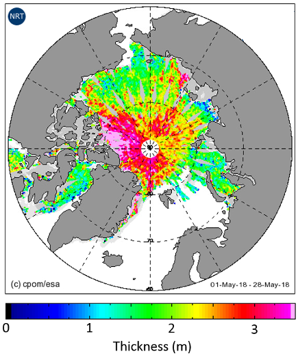 Figure 4. Average ice thickness from 1st – 28th May 2018, as estimated by the radar sensor aboard CryoSat-2. Image credit Centre for Polar Observation and Modelling (CPOM).