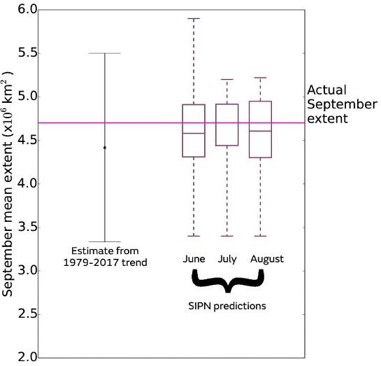 - Predictions of September ice extent this year as submitted to the Sea Ice Prediction Network (SIPN) were in the main relatively accurate, as is common in years where September ice extent has fallen close to the long-term linear trend.