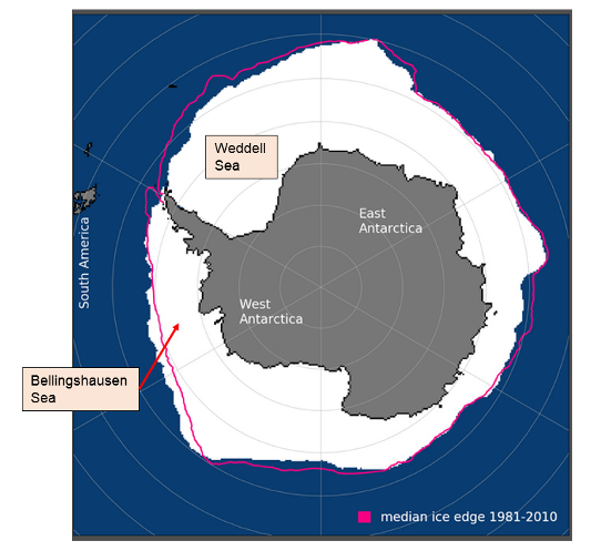 Figure 7. Average Antarctic sea ice coverage during September 2018, with average September sea ice extent from 1981-2010 indicated in pink. Data are from NSIDC.