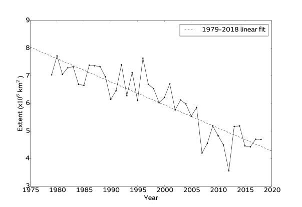 - Sea ice extent for September 2018 was 4.70 million square km, the joint-7th lowest in the satellite era (with September 2017). Extent was particularly low this year in the Laptev, Kara, Chukchi and western Beaufort seas.