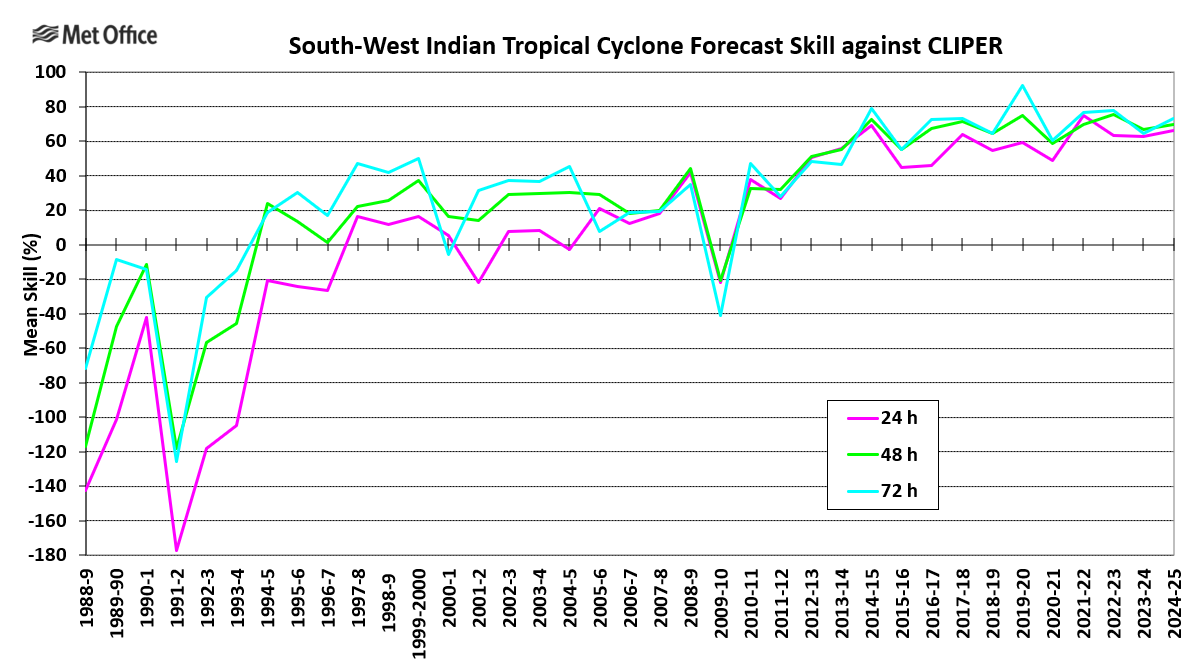 The graphs below show a variety of measures of forecast errors and forecast skill for the Met Office global model forecasts of tropical cyclones in the South-West Indian region (west of 90 degrees east).