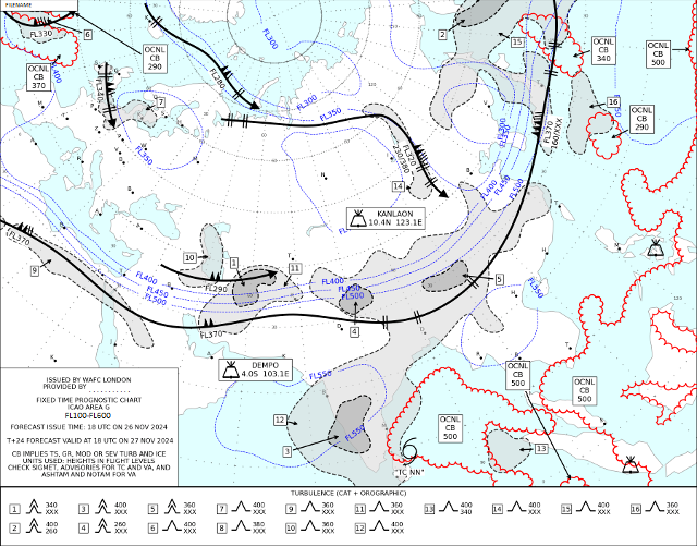 SIGWX charts are essential for pilots, providing a broad overview of significant weather relevant to their flight. Elements visible in these charts include jet streams (wind speeds exceeding 80 knots), areas of cumulonimbus clouds and turbulence, erupting volcanoes, and tropical cyclones.