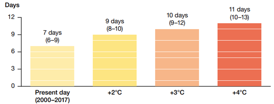 The projected average occurrence of days with heavy rainfall of more than 80mm per day for different global warming levels.