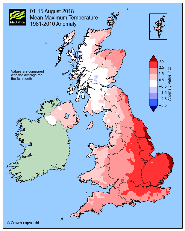 The record mean temperature for August was 17.3 degrees in 1995. Although the mid-month figure is some way short of this – currently August 2018 stands as the eighth-warmest on record – the consistently warm weather throughout June, July and August raises the prospect of more notable ranking of average temperature for the summer as a whole.