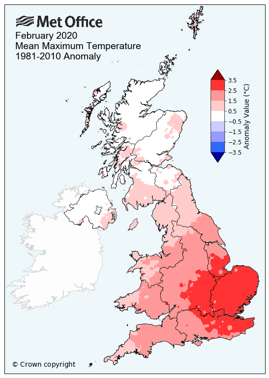 February 2020 has been the wettest February on record for UK, England, Wales and Northern Ireland, and the second wettest (behind February 1990) for Scotland. It has also been the fifth wettest of any calendar month in a series from 1862 behind only October 1903 (227mm), December 2015 (217mm), November 2009 (215mm), and December 1929 (213mm).