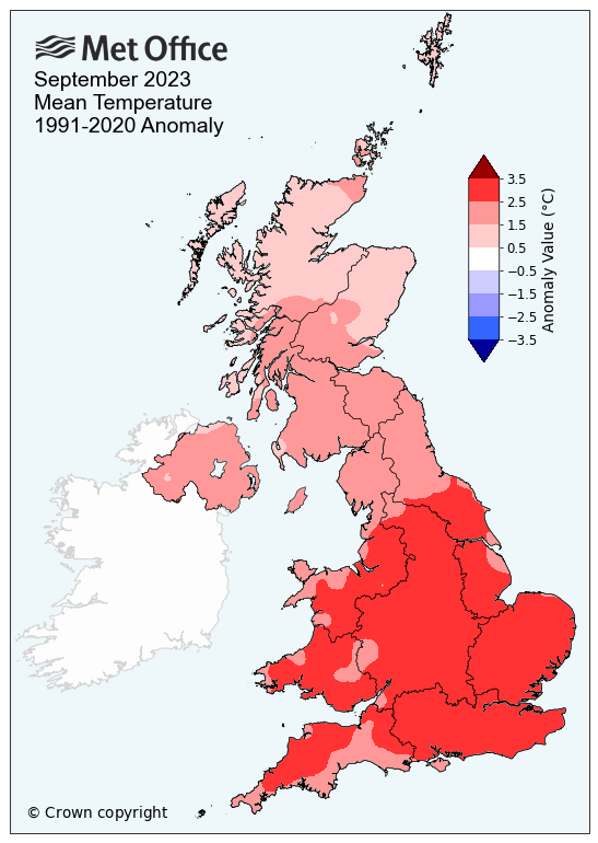 The early September heatwave saw temperatures exceeding 30°C somewhere in the UK for a run of seven consecutive days, a UK record. This resulted in the UK’s joint-warmest September on record for the UK – and the warmest for England and Wales – in series which go back to 1884.