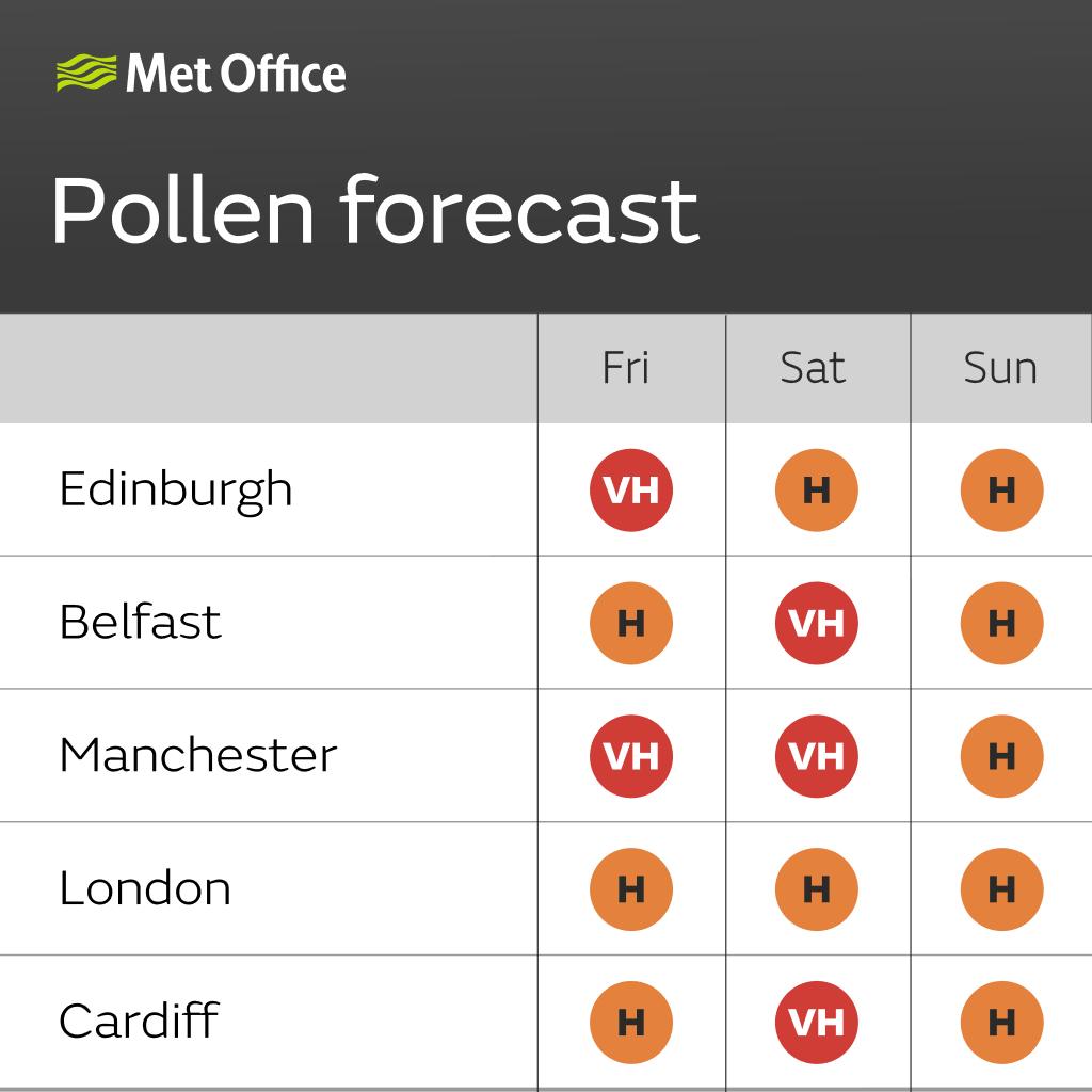While many northern and western and southwestern areas will continue to experience high pollen levels, conditions further east are likely to be milder before rising again across the weekend, with many areas experiencing high or very high levels.