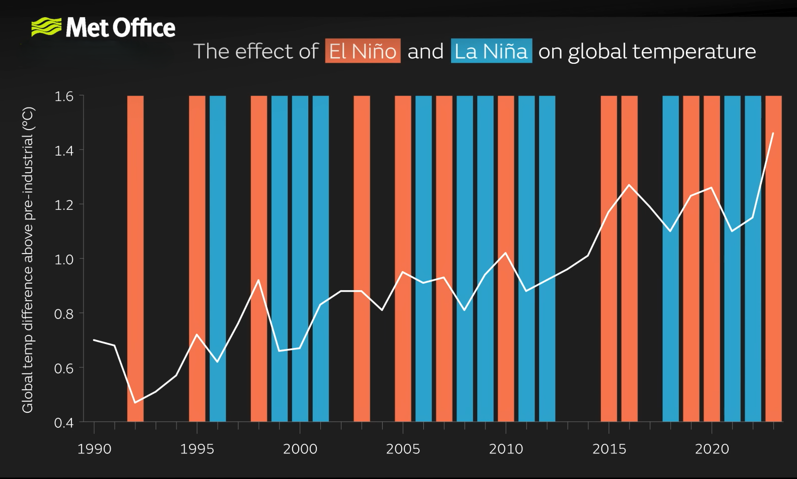 Historically, many of the warmest years on record have coincided with El Niño events. However, this warming effect sits on top of a longer‑term upward trend driven by human‑induced climate change. As a result, when a strong El Niño develops in today’s warmer climate, global temperatures can be pushed to particularly high levels.