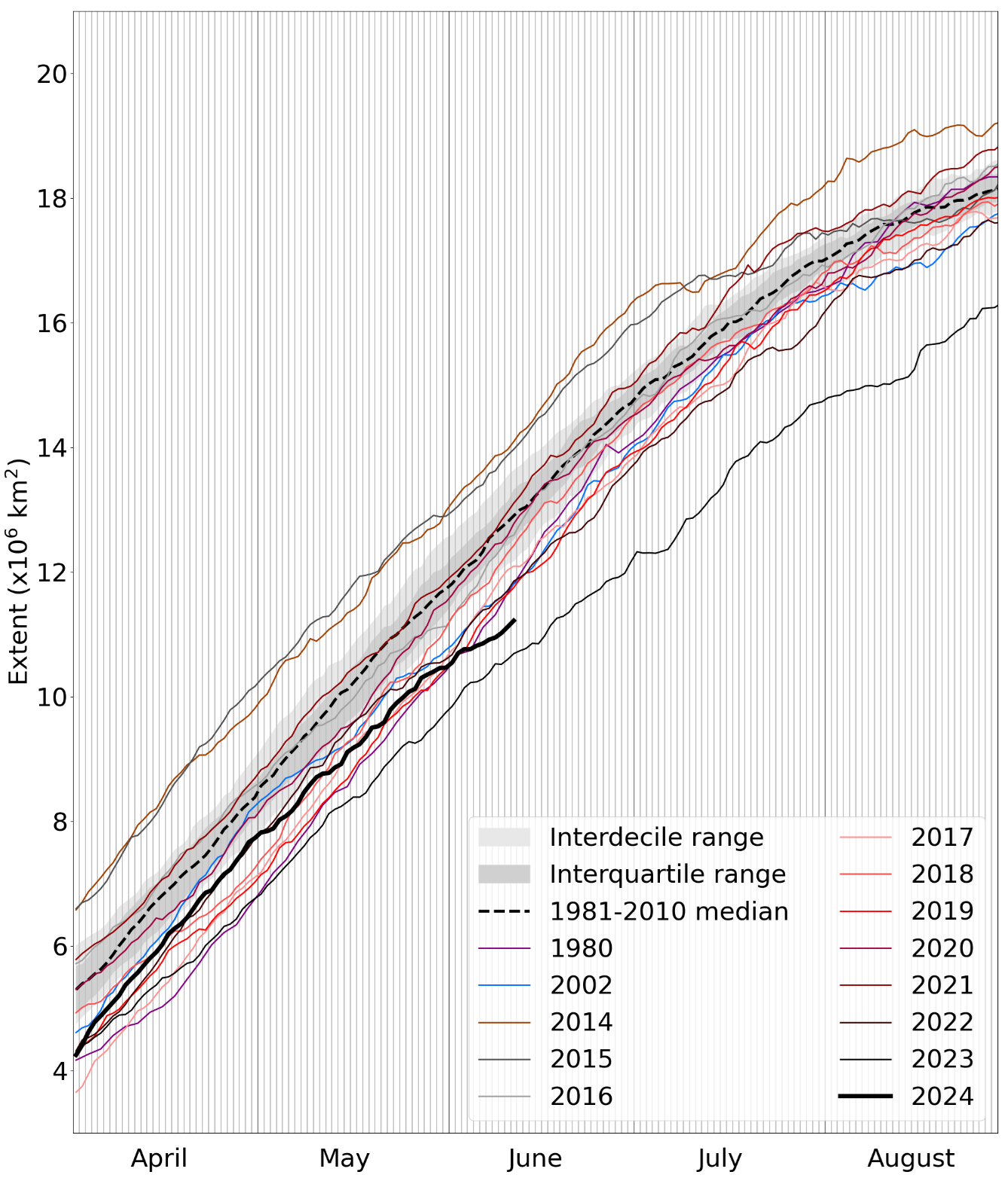 Arctic sea ice extent on 10th June 2024 was 11.21 million sq km (Figure 1) according to data from the National Snow and Ice Data Center (NSIDC). This was 0.87 million sq km below the 1981-2010 average, and was the 8th lowest value on record observed for this date, the lowest having been 10.86 million sq km in 2016.
