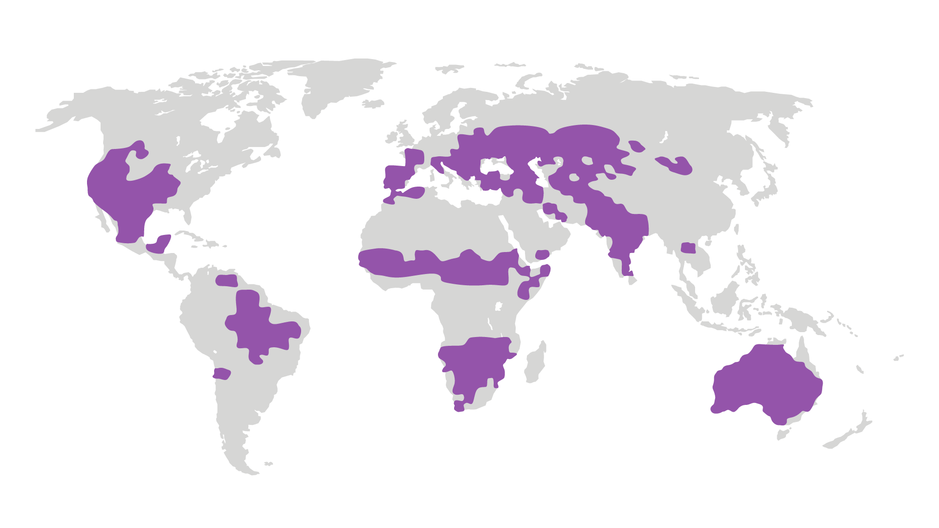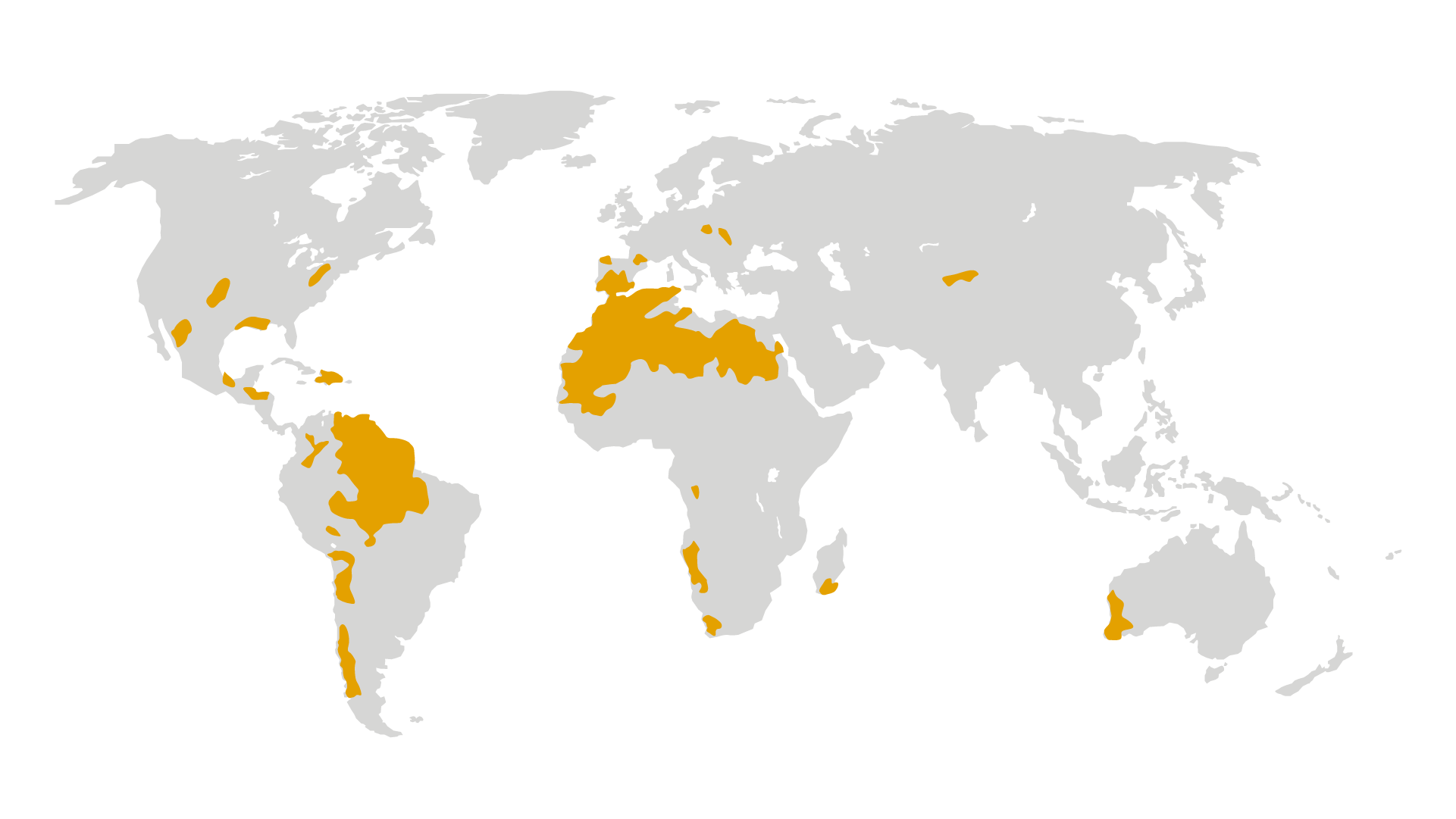 Hydrological drought is the relative reduction in the availability of water in rivers and can be defined using the Standardised Runoff Index (SRI). Here, severe and extreme drought is defined as the driest 24-day period of the year in the present climate. The map shows areas with more than a 25% increase in time under severe and extreme drought at 4° C global warming, in the ensemble mean of the HELIX climate projections. While the global average change in severe and extreme drought is close to zero, there are strong regional variations in the response of rainfall to climate change. For example, the bar chart shows the mean increase in time under this level of drought for the Mediterranean region.