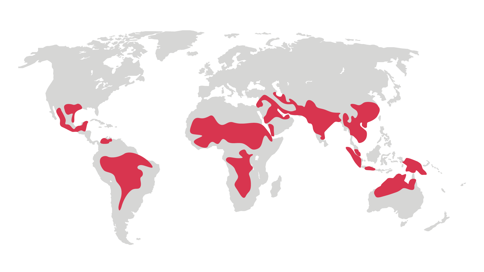 Human heat stress risk depends on both temperature and humidity, and is indicated using wet bulb globe temperature (WBGT). WBGT above 32 °C is defined as “extreme risk”. At this level, vulnerable members of the population, and those with physical, outdoor jobs are at greater risk of adverse health effects. The map shows areas where a WBGT greater than 32 °C occurs for more than 10 days per year at 4° C global warming, in the ensemble mean of models from the 5th Coupled Model Intercomparison Project (CMIP5). The bar chart shows the global total number of people exposed at this level for the present day, 2° C and 4° C global warming, in relation to present-day population.
