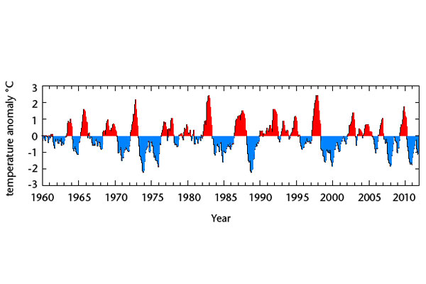 The ENSO cycle is illustrated in the figure by a time-series of the monthly sea surface temperature anomalies in a region of the central equatorial Pacific. This 'Niño3.4' region (5°S-5°N,120°W-170°W) is one of several used to monitor changes in the tropical Pacific. Definitions vary, but as a guide the El Niño and La Niña episodes occur when anomalies in this region are larger than about 0.5 °C in magnitude for several months. While a typical episode might last for three or four seasons, peaking in size in boreal winter, the time-series demonstrates that events are not entirely regular and have various sizes and durations. The climate system does not always simply alternate between El Niño and La Niña: the same type of event can occur successively or be sustained over several years.