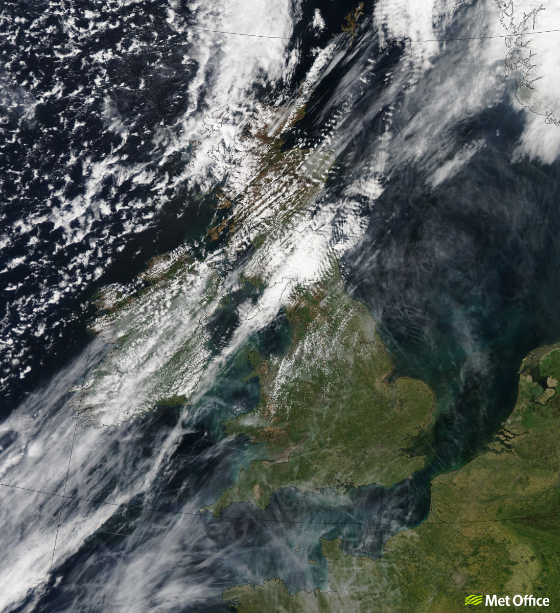 This true-colour image comes from MODIS (Moderate-resolution Imaging Spectroradiometer) onboard the NASA Terra polar-orbiting satellite a research satellite that is just over 700 km above the surface of the Earth. The image is from 11:11 UTC on 9 August 2016 and the data was collected directly from the satellite at the Met Office using our satellite receiving station.