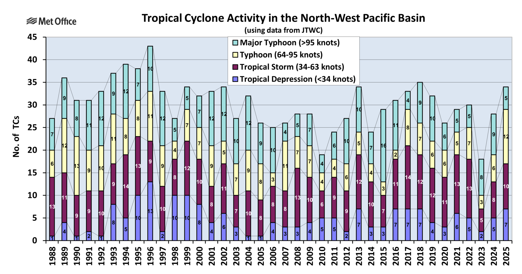 The charts show tropical cyclone activity in the North-West Pacific Ocean since 1988 and tracks for the most recent completed seasons.