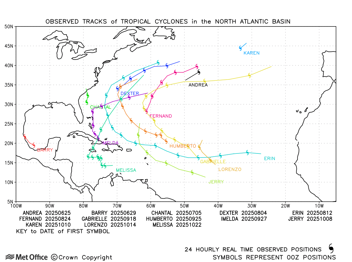 The table below shows the seasonal forecast values issued on 21 May 2025 for the June-November 2025 period together with the end of season observed values. This season the observed number of tropical storms, hurricanes, major hurricanes and ACE Index were all within the 70% forecast range.